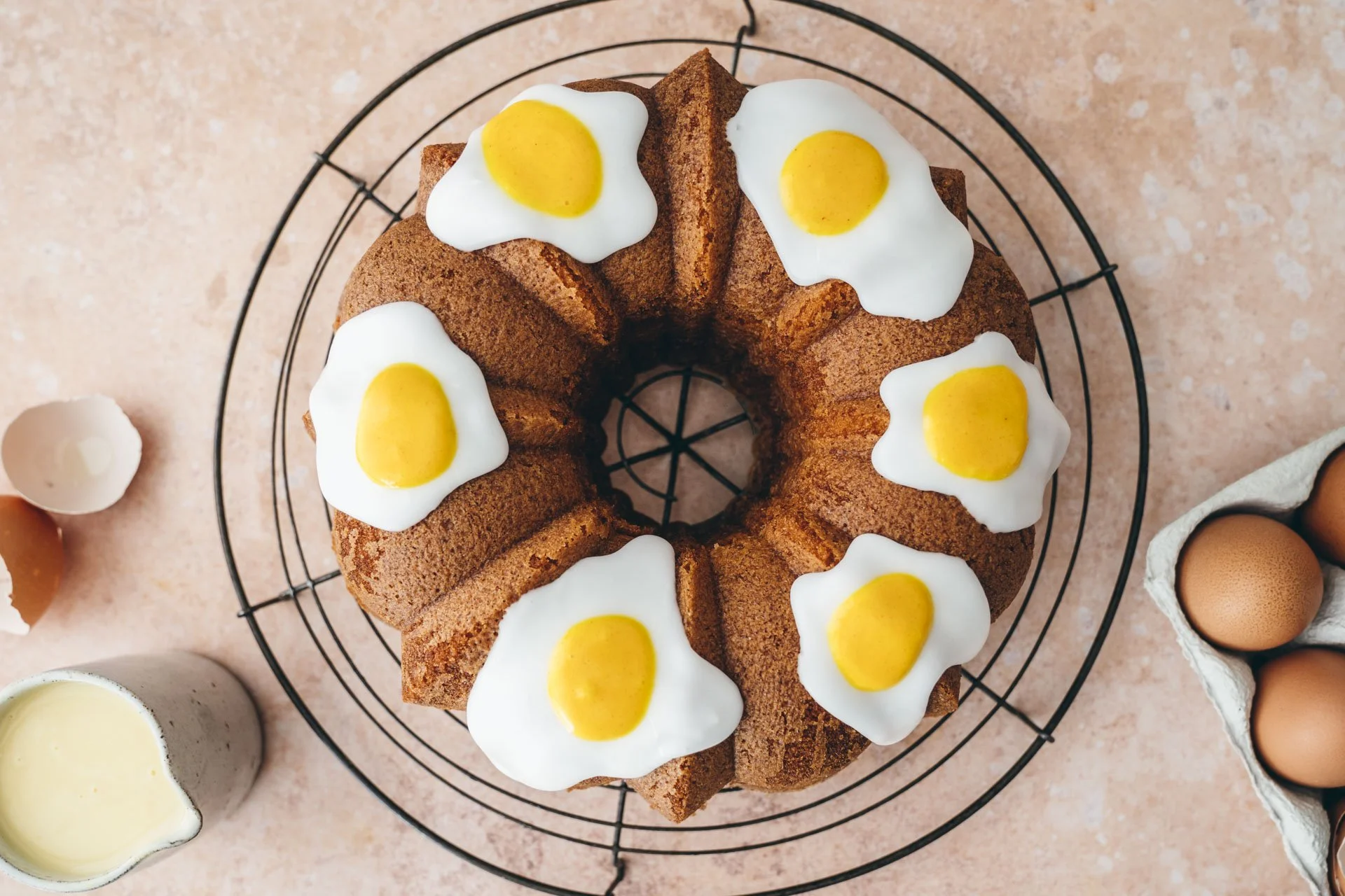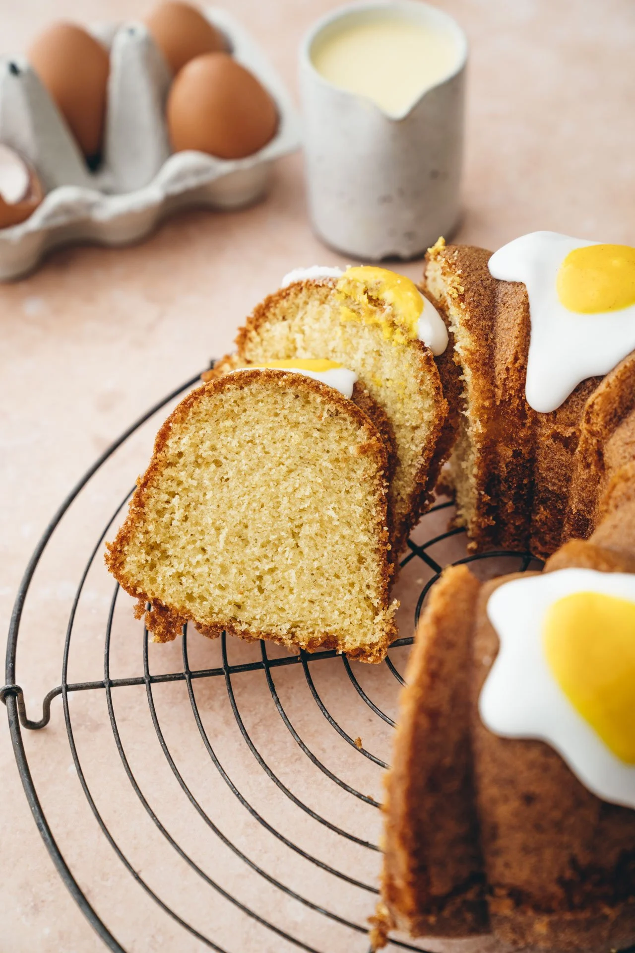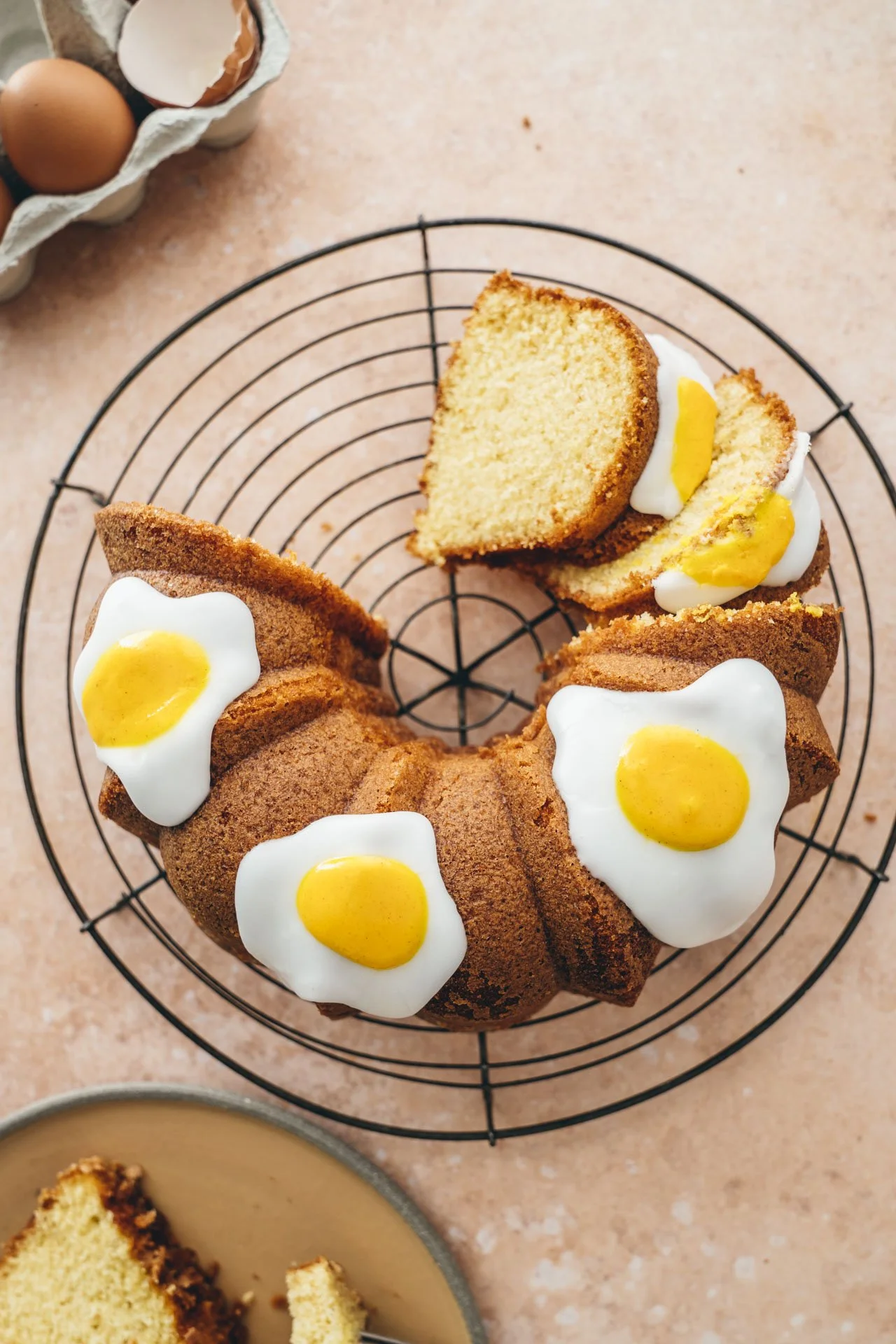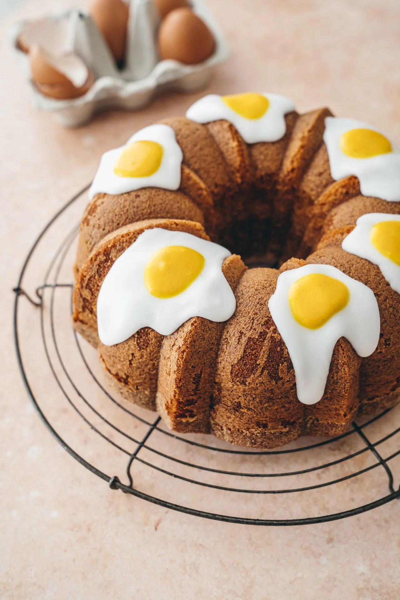 Ein saftiger Eierlikörkuchen gehört genau so zu Ostern, wie Häschen, Ostereier oder Hefezöpfe. Obwohl er auch ohne Dekoration traumhaft schmeckt, habe ich mir für den Gugelhupf eine passende Dekoration zu Ostern ausgedacht. Spiegeleier aus Zuckerguss. Die sind kinderleicht gemacht und definitiv ein Hingucker auf der Kuchentafel.