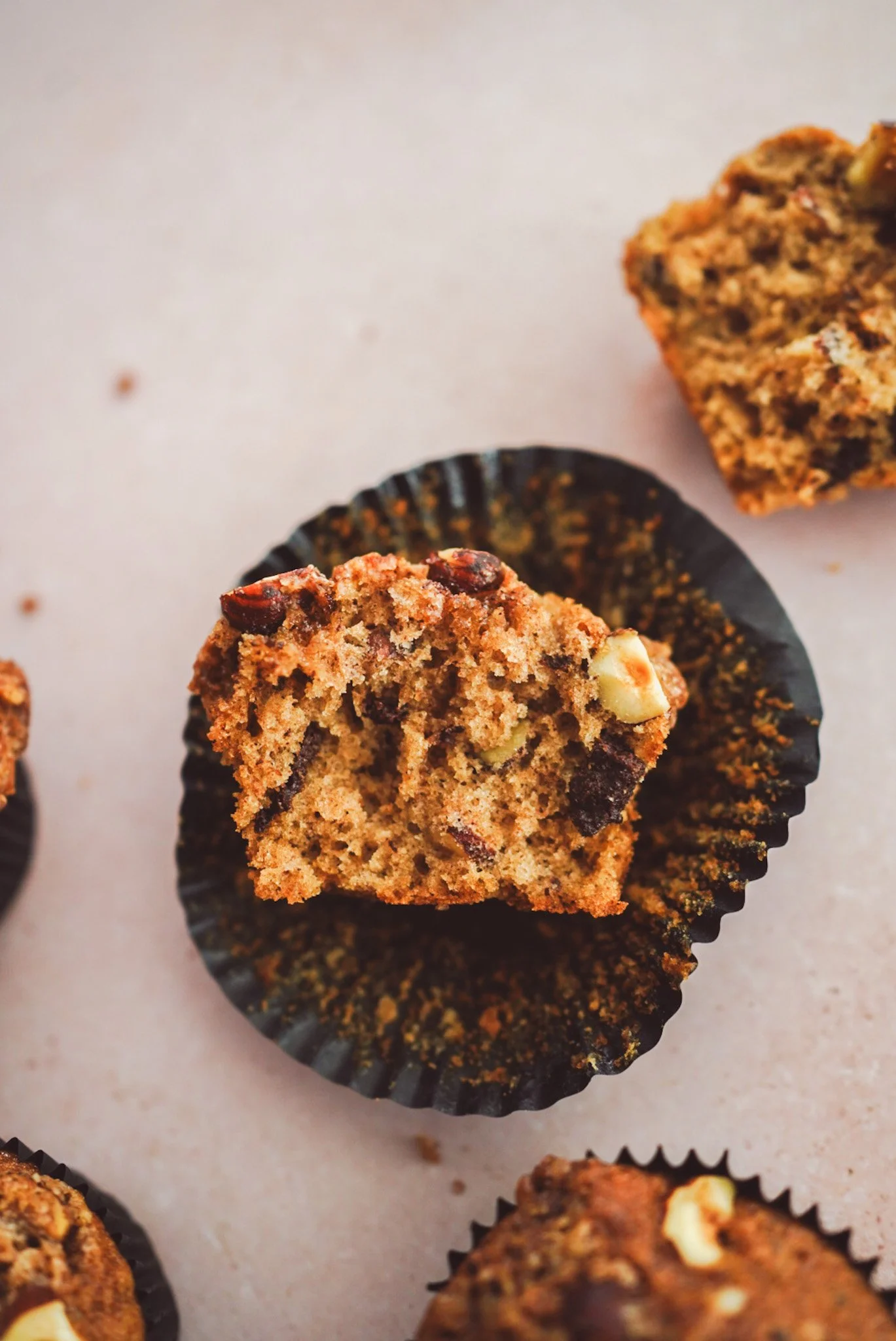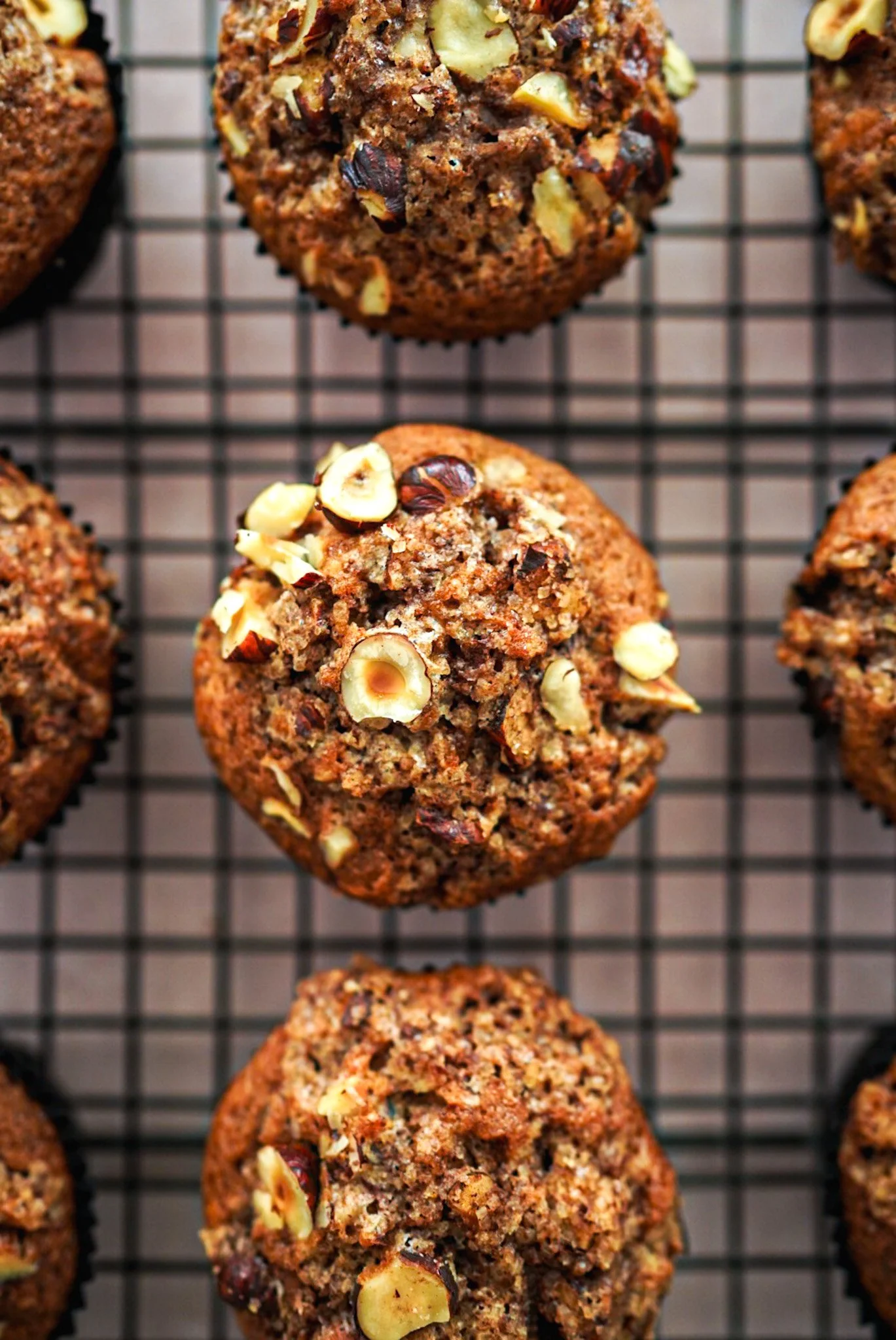 Den Teig gleichmäßig auf die Muffinförmchen verteilen. Mit den Streuseln und anschließend mit den restlichen grob gehackten Haselnüssen bestreuen und 20-25 Minuten backen.