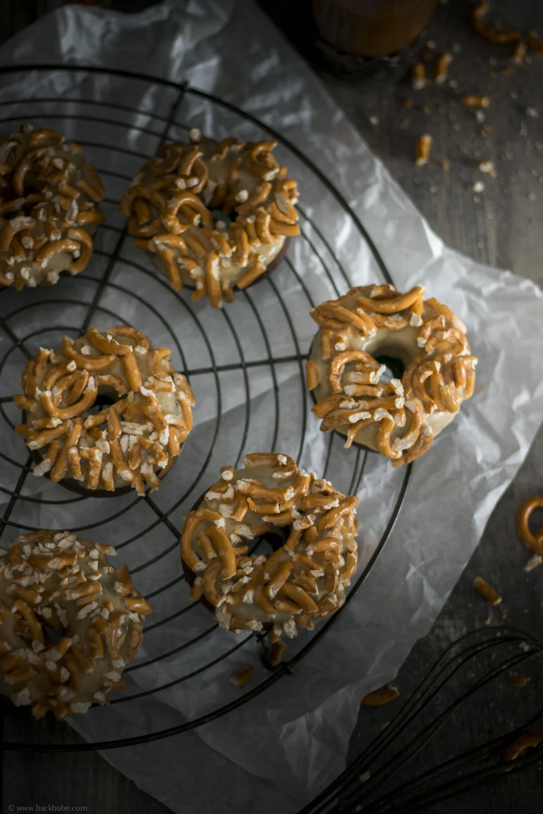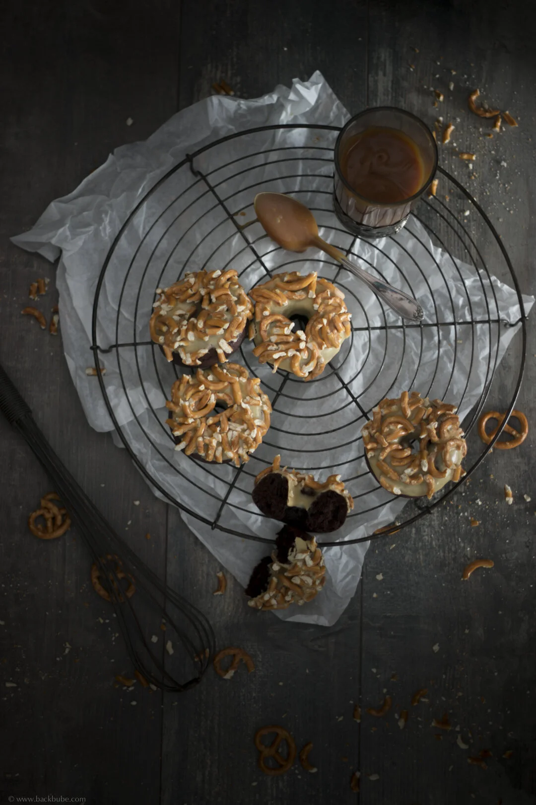 Ich muss zugeben, ich bin gerade ein bisschen im Donut-Fieber. Denn Anfang der Woche habe ich mir endlich mal ein Backblech für Donuts gegönnt. Ja ich weiß, Donuts werden normalerweise frittiert, aber mit dem Frittieren hab ich's nicht so, darum back ich mir lieber welche. Und nachdem ich jetzt schon zweimal wirklich entsetzt von der Qualität der Donuts einer sehr bekannten Franchise-Kette war, mache ich mir Donuts eh viel lieber selber. Und die Kalorien, die ich durch das "nicht-Frittieren" gespart habe, packe ich einfach in die Glasur mit hinein *hihi*. Darum gibt's als erstes Donut Rezept auch gleich mal so richtig kleine Kalorienbomben. Schokoladenteig, eine Glasur aus gesalzenem Karamell und Sahne, getoppt mit vielen vielen Brezelbröseln.