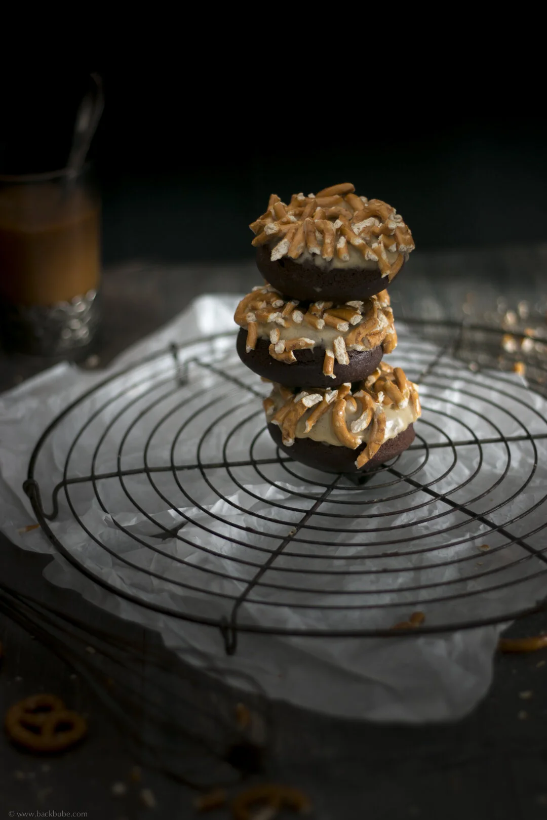Schoko-Donuts mit gesalzener Karamellglasur und Salzbrezel-Bröseln