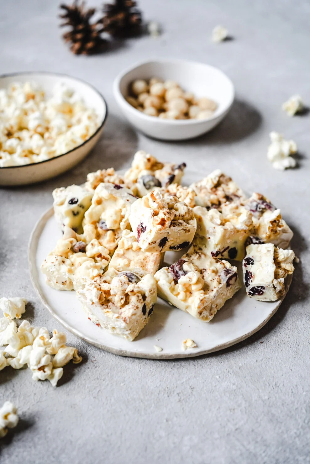 White Rocky Road Fudge mit Karamell-Popcorn / 1 blech (22x33cm)